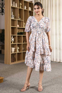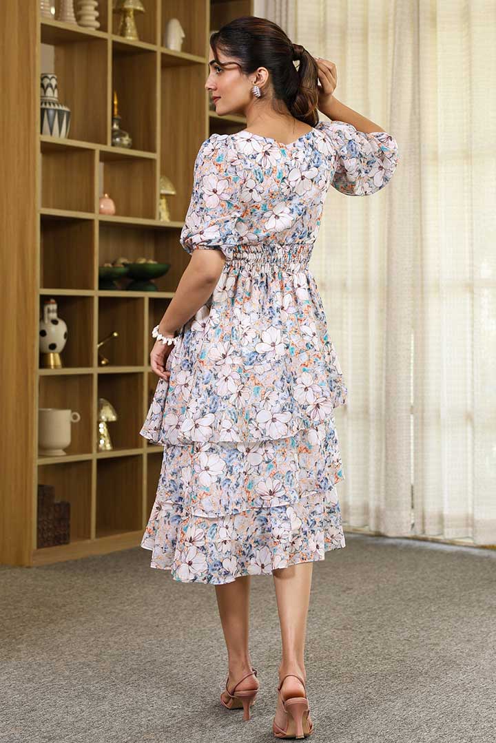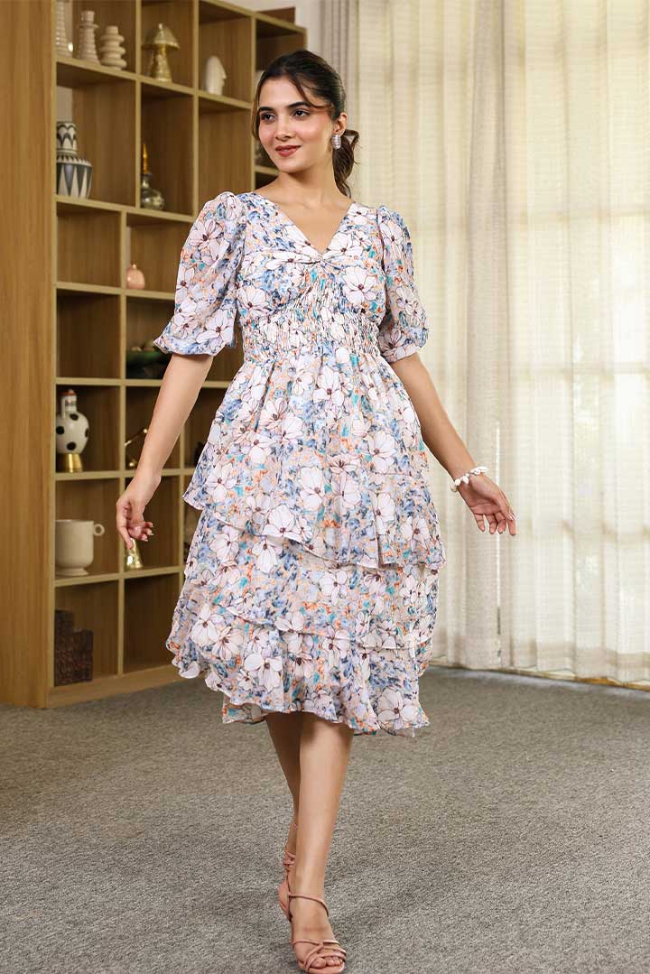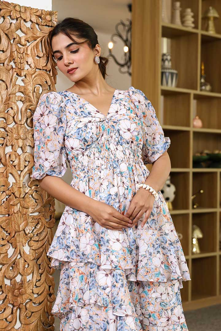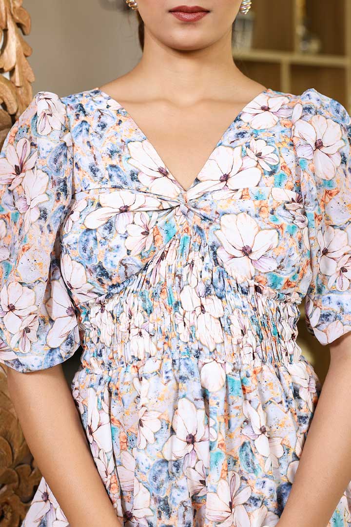 Blue Floral Printed Knotted Updown frill Mini Dress